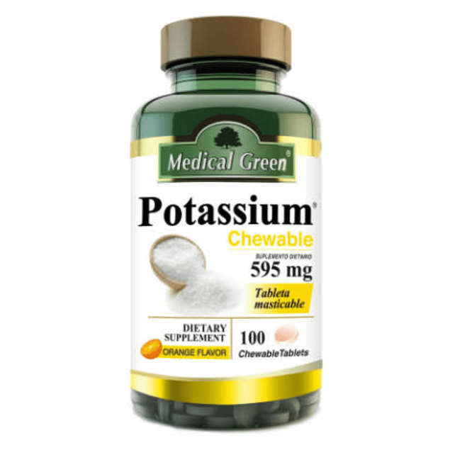 Potasio Masticable de Medical Green, es un suplemento que te proporciona 595 mg de Potasio y mejor un masticable con un delicioso sabor a naranja.
