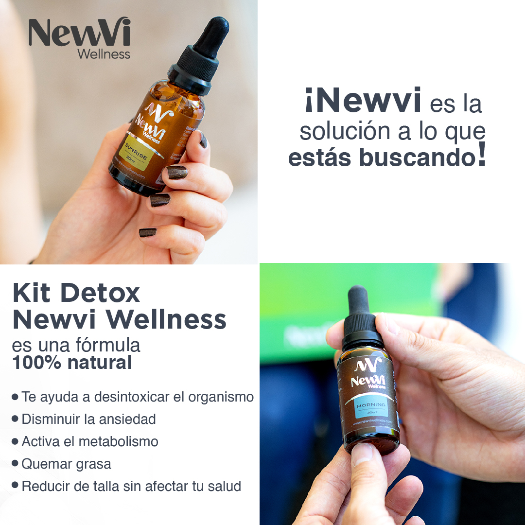 | Newvi Wellness Kit Detox apoya a la limpieza del cuerpo. Bajas de talla (por la desinflamación)y consiguiente de peso (actua drenando los líquidos de tu cuerpo). contrala la ansiedad, elimina las toxinas y los elementos pesados como metales. Cuida del sistema renal, intestinal y hepático, minimizando asi las grasas e inflamaciones. |