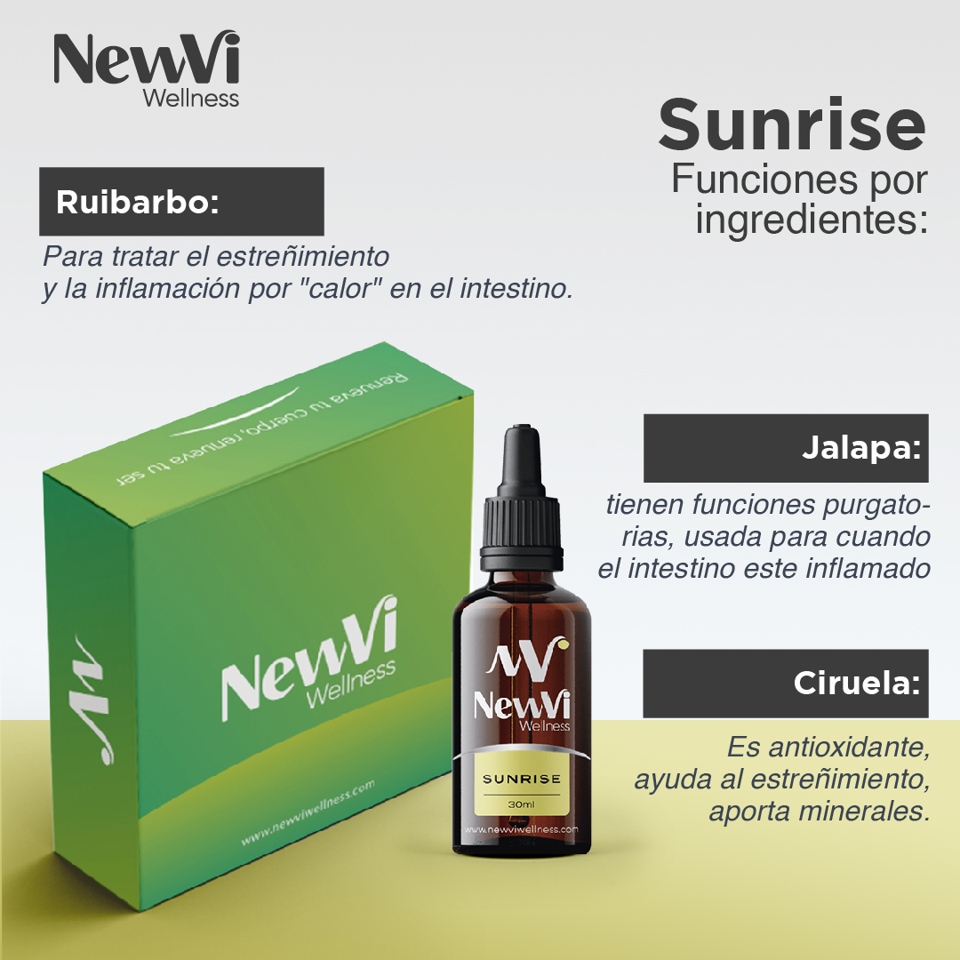 Sunrise (Frasco 1) Modo de uso Sunrise: mezclar 20 gotas en un vaso de agua y tomar en ayunas. Composición: Ruibarbo, Jalapa, Ciruela. Funciones por ingredientes: Ruibarbo: Para tratar el estreñimiento y la inflamación por «calor» en el intestino, ayuda a eliminar toxinas del cuerpo Jalapa: Origen mexicano de Xalapa, tienen funcionas purgatorias, usada para cuando el intestino este inflamado, con dolores o cólicos. Ciruela: Es antioxidante, ayuda al estreñimiento, aporta minerales, ayuda a perder peso, mejora la digestión.