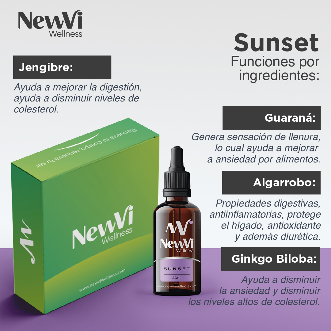 Sunset (Frasco 3) Modo de uso Sunset: mezclar 20 gotas en 1 botella de agua (750 mL mínimo) y tomar durante la tarde hasta antes de las 6pm. Composición: Guaraná, Algarrobo, Jengibre y Ginkgo Biloba. Funciones por ingredientes: Jengibre: Ayuda a mejorar la digestión y ayuda a disminuir niveles de colesterol. Guaraná: Genera sensación de llenura, lo cual ayuda a mejorar la ansiedad por alimentos, es un energizante natural y antioxidante. Algarrobo: Tiene propiedades digestivas, antiinflamatorias, protege el hígado, es antioxidante y además diurético. Ginkgo Biloba: Ayuda a disminuir la ansiedad y disminuir los niveles altos de colesterol. |