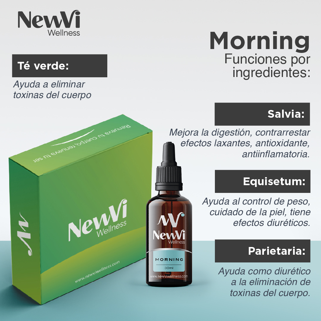 Morning (Frasco 2) Modo de uso Morning: mezclar 20 gotas en una botella de agua (750 mL mínimo) y tomar durante la mañana hasta antes de mediodía. Composición: Té verde, Salvia, Equisetum, Parietaria, Martin Galviz. Funciones por ingredientes: Té verde: Fomenta la reducción de grasa, mejora el rendimiento físico, ayuda a perder peso y disminuye el riesgo de obesidad, favorece la combustión de la grasa y es antioxidante. Salvia: Mejora la digestión, contrarresta efectos laxantes, antioxidante, antiinflamatoria, relajante y es usada para disminuir ansiedad. Equisetum: Ayuda al control de peso, cuidado de la piel, tiene efectos diuréticos, por lo tanto, ayuda a eliminar toxinas. Parietaria: Ayuda como diurético en la eliminación de toxinas del cuerpo. Martin Galviz: Propiedades laxantes que ayudan a limpiar el intestino. Beneficios Sunset Da energía y ayuda a quemar grasa, reduce ansiedad de antojos.